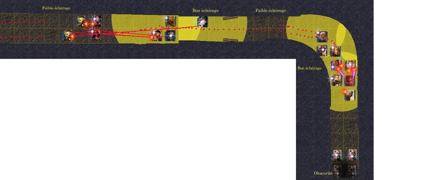 Un problème se posait, ses adversaires reculaient vers un coin plus sombre, et lui même avait le désavantage de ne pas percer l'obscurité. Il se concentra sur la situation, essayant de faire abstraction de ses idées noires qui lui laissaient imaginer combien ils allaient encore rencontrer de ces créatures squelettiques et comment ils allaient finir leur vie, dévorés par des créatures de l'enfer dans un cachot qui devait être un post avancé d'Hextor sur Toril. Ils étaient sans doute plusieurs à ne pas distinguer formes et couleurs dans l'obscurité, et ils avaient sans doute un énorme désavantage par rapport aux mort-vivants sur ce point. Il fallait donc mieux se réorganiser, puisque le temps leur en était donné, plutôt que de se disperser et de partir à l'aveuglette.