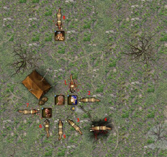 Volant au secours du halfelin en mauvaise posture, il se déplaça d’un grand pas en couvrant ses arrières de sa hallebarde et vint se positionner entre la tente dressée et le petit-homme au sol. Là, il laissa déferler de nouveau en lui la puissance divine du Magefeu et tenta d’immoler le loup qui par miracle avait survécu à sa première décharge. De cette place il savait qu’il pourrait continuer de frapper la meute des canidés qui essaierait de s’approcher et cela grâce à son allonge supérieure. Si nécessaire il ajusterait sa distance pour garder son avantage.Absurbanipal pas de placement puis Magefeu (2d6) sur Loup 7