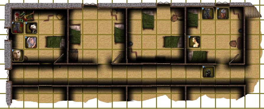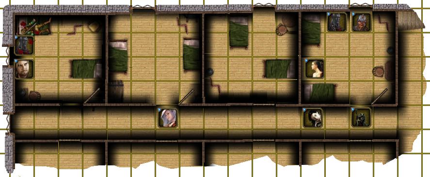 Hermine, qui s'était ressaisie mais qui était toujours trop enrouée pour parler correctement, poussa un grognement menaçant et s'élança. Elle avait abandonné l'idée de prendre l'assassin vivant : profitant de la mauvaise orientation défensive vis à vis d'elle de son adversaire que lui avaient forcé à prendre l'attaque du barde et sa propre riposte, la guerrière feinta de corps et fit un bond de coté tout en ramenant son épée longue en un coup d'estoc circulaire. Le drow, davantage tourné vers Vieltal, négligeait de défendre son coté gauche désarmé. Se ruer encore plus avant dans son angle mort laisserait tout le temps à Hermine d'enfoncer la pointe sa lame dans le dos ou le cou de l'assassin ...Hermine attaque en faisant un pas de placement (case au Nord).