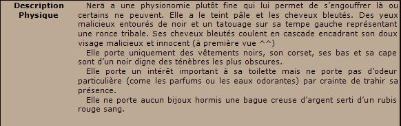 Nerä, pourrais-tu copier-coller ton BG et ta description psychologique dans un Post à la suite ? Je pourrais alors l'intégrer dans la fiche Word.