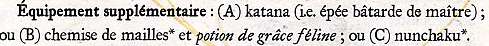Jet d’Attaque au corps à corps1 : BBA+1 +1(Katana*) +1d20 (Katana*, dégâts 1d10 +1, 19-20/x2)Jet d’Attaque au corps à corps2 : BBA+1+1d20 (Dague, 1d3 / 1d4 +1, 19-20/x2)