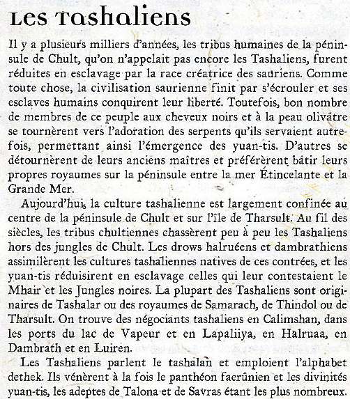 n peut imaginer une famille Tashaliens qui habiterait donc dans l'Amn aux alentours de Riatavin. Et qui y vivrait depuis plusieurs génération, cependant ils restent attaché à leurs coutumes et rites. Peut être que pour l'instant développer n'est pas encore utile. Je pourrais le faire petit à petit au fur à mesure de l'augmentation de mes connaissances sur les royaumes oubiés.
