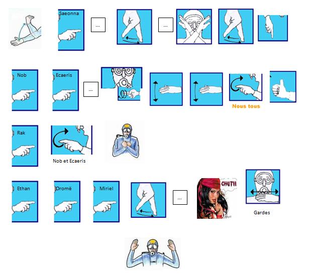 Enfin, elle haussa les épaules et plaça ses mains en balance de part et d'autre de son corps, pour bien signaler à tous que ce n'était qu'une proposition, et qu'il fallait en discuter ... mais tout se jouerait sous peu !Je vous met en pièce jointe les signes que Miriel fait pour peut-être éclairer un peu mes gestes ... les symboles sont dans l'ordre bien sûr, et chaque ligne correspond à une "étape". Je m'excuse par contre parce que j'ai du utiliser pour le coup des signes de plongées, et qu'il y a donc des plongeurs de représenté !