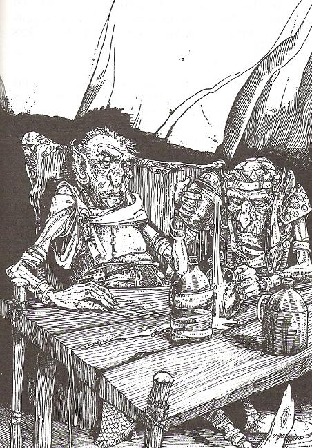 MJMuranor : Dans la salle il n'y avait pas grands choses, une bougie sur la table éclairaient les deux orques ivrognes, sous la table un petite boîte en bois comme dans l'autre pièce, les dimensions étaient également similaires. Deux paillasses étaient roulées au fond de la pièce, certainement les couches que les deux orques n'ont pas eu le temps de déplier. Ils ronfflaient aussi fort l'un que l'autre et n'avait pour le moment pas bougé d'un poil, ni montraient de signes qu'ils avaient entendu Muranor et Krum parler.