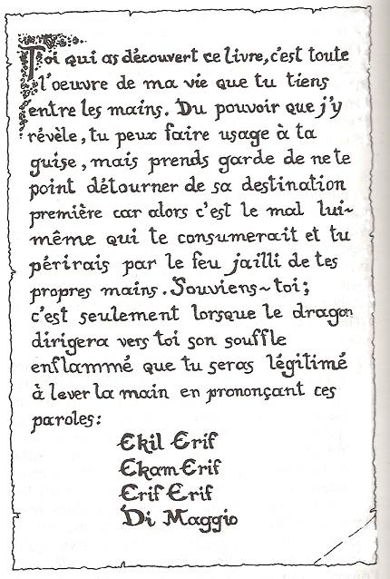 Le livre avait été écris dans une écriture minuscule, il exposait dans ces pages l'oeuvre de la vie du magicien sus nommé, c'est-à-dire la découverte et la création d'une formule magique qui permettait de neutraliser les dragons ou plus précisément leur souffle ardent. Les lignes apprennaient au drow que lorsque Farrigo parvînt à mettre au point parfaitement ce sort, il vivait les dernières années de sa vie; Devenu alors trop vieux pour faire lui-même usage de sa trouvaille, il se contenta de la consigner dans ce petit livret qu'il enferma dans un coffre. Mais effrayé à l'idée que l'ouvrage pût tomber entre de mauvaises mains il donna le livre à un demi-orque ignare de son village qui voulait rejoindre sa famille à Port-Crânes.