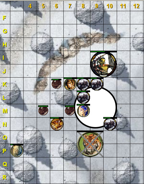 Ylinya ne tergiversa pas en longues réflexions, envoyant juste une rapide prière à son aquatique dieu pour qu'elle parvienne à ses fins… Alors même qu'elle se déplaçait, en évitant les drows les plus proches, elle fut soulagée de voir qu'Ernst semblait relativement indemne. Malheureusement, même si son instinct primaire était de chercher à le protéger lui aussi, elle se retrouvait obligée de lui demander son aide de façon un peu plus active...-                             Elle espérait juste qu'elle ne l'envoyait pas à la mort… Elle avait seulement besoin qu'il lui offre l'opportunité de pouvoir s'occuper d'Ozalee, juste une poignée de secondes où elle n'aurait pas à s'inquiéter de son environnement. Elle savait qu'elle aurait à poser un genou à terre pour pouvoir toucher la tigresse alors qu'elle ferait appel aux forces naturelles pour pouvoir lui insuffler suffisamment d'énergie pour qu'elle puisse passer outre le temps normal nécessaire aux premiers stades de guérison... Dans l'ordre : Se déplace par l'ouest en Q7 (si possible sinon au contact d'Ozalee mais pas devant son adversaire) Dressage sur Ernst Lance Soins Modérés sur Ozalee (rend 2D8 PV +1/niv = 2D8 +7)