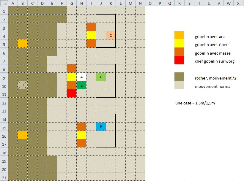 - Abakor tire sur Gobelin en B10 : 8 pts de dégâts : mort - Uranel tire sur Chef Gobelin en B13 : o jet d’équitation du Chef Gobelin DD15, échec : pas de couverture o 6 pts de dégâts - Ennel se déplace en H10 pour intercepter le Worg (défense) - Worg se déplace en G11 et frappe Ennel : échec - GobB3 double mouvement vers I3 - GobB4 double mouvement vers I4 - GobB5 tire sur Christal J3 : échec - GobB6 double mouvement vers I5 - GobB8 double mouvement vers G8 - GobB9 double mouvement vers G9 - GobB10 : mort - GobB11 double mouvement vers G10 - GobB15 double mouvement vers H15 - GobB16 tire sur Blingabel : échec - GobB17 double mouvement vers H16 - GobB18 double mouvement vers H17 - Christal assure sa position +sort : assistance divine Abakor avait à cœur de rattraper ce qu’il prenait seul comme son erreur. Si l’embuscade avait été réalisée de manière plus « logique », il l’aurait détectée, mais la topographie du terrain était bien trop désavantageuse pour les gobelins aux courtes jambes et leur empêcha strictement d’être sur les aventuriers dès le début de l’assaut. A l’exception de leur chef, se tenant à la crinière du Worg qui montrait des canines démesurées face à son homologue, les monstres étaient incapables de les rejoindre, ne prenant pas le risque de courir entre les rochers. Le rôdeur, d’une flèche, abattu le premier archer qui n’avait même pas eu le temps d’assurer son tir.