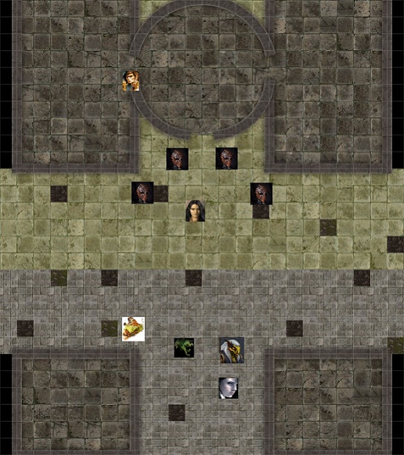 llez, triple post, on est plus à ça prêt XD Voici la carte de la zone avec les positions que j'ai imaginé avec vos descriptions. Yvae, tu es sur le toit à la jonction entre la tour et l'autre bâtiment. Tu es a plus de 9 mètres. Tu es en gros a 7 cases donc a 12m en ligne droite puisque tu es à 5m de haut. Pas de jets ce tour ci. @Agath's Tu peux prendre un peu de temps pour fouiller la pièce si le cœur t'en dis. On fera la résolution de la fouille en HRP.(je voulais pas faire stagner l'histoire pour une fouille, mais tu peux trouver des truc quand même...sait on jamais. ) actuellement, les quatre mecs t'ont pas vu et le change forme se dirige vers la sortie. il n'a pas été reconnu par le grand brulé, mais par contre il a été clairement identifié comme le niquedouille du temple par les druides. ils sont entre toi et la sortie.