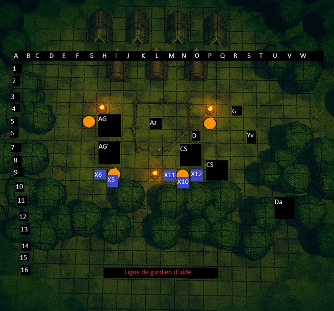 ous voili parta ! (+1 a celui qui a la ref ^^) J'avais pas pensé à le faire se mêler aux enfants le Starym... Dommage ça aurait pu être rigolo! Un fight sur deux fronts, un ici et l'autre a Thuldae  enfin, il aurait pas fait long feu la bas malgré tout... Et en plus il est machiavélique mais s’abaisser a se transformer en sous race...hummmm...pas certain que ça serait passé. Je résous tout ça dans l'ordre, et je fait un bilan. Le premier jet d'Agath's en dégâts était pas le bon, il fallait enlever les dégâts contre un mage....bon 2PV d'écart, ça fait la différence mais ça change pas ma description ^^. J'avais oublié le 3 et le 6 dans le plan précédent. Ils étaient a coté de la position précédente de Dinenda, et se sont retourné contre le familier d'Agath's. (désolé pour cet oubli) Yvae....Yvae....je commence enfin a m'y retrouver dans ce fatra et toi tu fait quoi???? tu m'en rajoute ?????? allez, va pour des chauves souris sanguinaires alors ! Asur'ael, sauf erreur de ma part, téléportation, s'envoler dans les airs et attaquer ca fait un peu beaucoup en un tour. (sauf si tu as une magie comme celle de Dinenda qui te le permet mais je l'ai pas vu désolé) Du coup je prends ton attaque et le TP et tu t’envolera plus tard si ça te va? En plus si tu pouvais corriger ta phrase au millieu du post...elle ne fait pas trop sens pour moi même si j'ai vaguement compris l'idée XD Voila, j'espère que j'ai pas trop merdé, ya eu du ménage là ! Trois gardes et deux mages en moins ! Ça fait du ménage...mais ya aussi des protections magiques qui tombent avec la dissipation ! Alors planquez vous ! Voici la carte mise a jour avec les trois gardes que j'avais oublié la dernière fois. (un sur dinenda et deux sur Ag') Les grosse bestioles CS c'est les chauves souris d'Yvae, yen a déjà une qui a disparu ! En face de vous, ya le XL4 qui tire la tronche très très fort Les XL3 ; 8 ; 9 ; qui fatiguent mais ça tien encore Les autres ca roule globalement. En particulier 11 et 12 qui pètent le feu. Petit ajout pour vous mette un peu plus de pression, le feu va bientôt se propager aux barrières. Je sais pas ou ca va nous amener cette nouvelle idée mais on verra bien Dharasha est remontée a 7PV. Dinenda est a 47 Agath's est a 67 Ag' 46 Godrick 20 les autres full life. Evidement si j'ai raté un truc, dites le moi et je corrige ! (pour la dissipation par exemple j'était pas sur de moi donc dans le doute j'ai ajouté le niveau de sort au DD...c''est donc a votre avantage  ) Lancers... Agath's Gromalogh - Jet d'attaque au CaC : 8(d20) +21 = 29 ~ Réussite Agath's Gromalogh - Jet d'attaque au CaC : 19(d20) +16 = 35 ~ Réussite Agath's Gromalogh - Jet d'attaque au CaC : 12(d20) +16 = 28 ~ Réussite Agath's Gromalogh - Jet de dégât : [5+2](2d6)+3+10+[1+3](2d6)-3(d3) = 21 Agath's Gromalogh - Jet de dégât : [1+1+2+2](4d6)+6+20+[1+1+3+2](4d6)-[2+3](2d3) = 40 Garde XL4 - Jet de vigueur : 19(d20)+9 = 28 vs DD25 ~ Réussite Agath's Gromalogh - Jet de dégât : [3+6+1+3](4d6)+6+20-1(d3) = 38 Ag' - Jet d'attaque au CaC : 20(d20)+21 = 41 ~ Réussite Ag' - Jet d'attaque au CaC : 8(d20)+21 = 29 ~ Réussite Ag' - Jet d'attaque au CaC : 13(d20)+21 = 34 ~ Réussite Ag' - Jet de dégât : [5+4+1+1](4d8)+20 = 31 Ag' - Jet de dégât : [3+2](2d8)+10 = 15 Ag' - Jet d'attaque au CaC : 13(d20)+21 = 34 ~ Réussite Ag' - Jet de dégât : 5(d6)+5 = 10 Garde XL5 - Jet de vigueur : 15(d20)+9 = 24 vs DD25 ~ Echec Garde XL3 - Jet d'attaque au CaC : 12(d20)+15 = 27 vs DD33 ~ Echec Garde XL3 - Jet d'attaque au CaC : 6(d20)+15 = 21 vs DD33 ~ Echec Garde XL6 - Jet d'attaque au CaC : 2(d20)+15 = 17 vs DD33 ~ Echec invoc 1 - Jet d'attaque au CaC : 16(d20)+5 = 21 ~ Echec invoc 1 - Jet d'attaque au CaC : 9(d20)+5 = 14 ~ Echec invoc 1 - Jet d'attaque au CaC : 10(d20)+5 = 15 ~ Echec Garde XL4 - Jet d'attaque au CaC : 14(d20)+15 = 29 vs DD41 ~ Echec Garde XL4 - Jet d'attaque au CaC : 8(d20)+10 = 18 vs DD41 ~ Echec Garde XL4 - Jet d'attaque au CaC : 20(d20)+5 = 25 vs DD41 ~ Echec Garde XL4 - Jet d'attaque au CaC : 10(d20)+5 = 15 vs DD41 ~ Echec Garde XL4 - Jet de dégât : 9(d10)+4 = 13 Magicien 3 - Jet de volonté : 15(d20)+9 = 24 vs DD21 ~ Réussite Magicien 4 - Jet de volonté : 9(d20)+9 = 18 vs DD21 ~ Echec Garde XL1 - Jet de volonté : 3(d20)+4 = 7 vs DD21 ~ Echec Garde XL2 - Jet de volonté : 10(d20)+4 = 14 vs DD21 ~ Echec Garde XL3 - Jet de volonté : 14(d20)+4 = 18 vs DD21 ~ Echec Garde XL5 - Jet de volonté : 4(d20)+4 = 8 vs DD21 ~ Echec Garde XL6 - Jet de volonté : 11(d20)+4 = 15 vs DD21 ~ Echec Garde XL7 - Jet de volonté : 19(d20)+4 = 23 vs DD21 ~ Réussite Garde XL8 - Jet de volonté : 14(d20)+4 = 18 vs DD21 ~ Echec Garde XL9 - Jet de volonté : 2(d20)+4 = 6 vs DD21 ~ Echec Garde XL10 - Jet de volonté : 9(d20)+4 = 13 vs DD21 ~ Echec Garde XL11 - Jet de volonté : 1(d20)+4 = 5 vs DD21 ~ Echec Garde XL12 - Jet de volonté : 4(d20)+4 = 8 vs DD21 ~ Echec Dinenda - Tour de terreur : 4(d6)+4 = 8 Dinenda - Jet d'attaque au CaC : 15(d20) +20 = 35 ~ Réussite Dinenda - Jet d'attaque au CaC : 9(d20) +15 = 24 ~ Echec Dinenda - Jet d'attaque au CaC : 20(d20) +20 = 40 ~ Réussite Dinenda - Jet d'attaque au CaC : 10(d20) +20 = 30 ~ Réussite Dinenda - Jet de dégât : 7(d8)+14+6(d6) = 27 ~ Réussite Dinenda - Jet de dégât : [8+1](2d8)+28+[2+2](2d6)+8(d10) = 49 Azur'ael - Jet de dégât : 1(d4)+5 = 6 Azur'ael - Jet de dégât : 3(d4)+5 = 8 Azur'ael - Jet de dégât : 2(d4)+5 = 7 Azur'ael - Jet de dégât : 3(d4)+5 = 8 Azur'ael - Jet de dégât : 2(d4)+5 = 7 Garde XL9 - Jet d'attaque au CaC : 16(d20)+13 = 29 vs DD34 ~ Echec Garde XL9 - Jet d'attaque au CaC : 6(d20)+8 = 14 vs DD34 ~ Echec Garde XL9 - Jet d'attaque au CaC : 3(d20)+3 = 6 vs DD34 ~ Echec Garde XL8 - Jet d'attaque au CaC : 4(d20)+13 = 17 vs DD34 ~ Echec Garde XL8 - Jet d'attaque au CaC : 1(d20)+8 = 9 vs DD34 ~ Echec Garde XL8 - Jet d'attaque au CaC : 4(d20)+3 = 7 vs DD34 ~ Echec Garde XL2 - Jet d'attaque au CaC : 15(d20)+13 = 28 vs DD34 ~ 