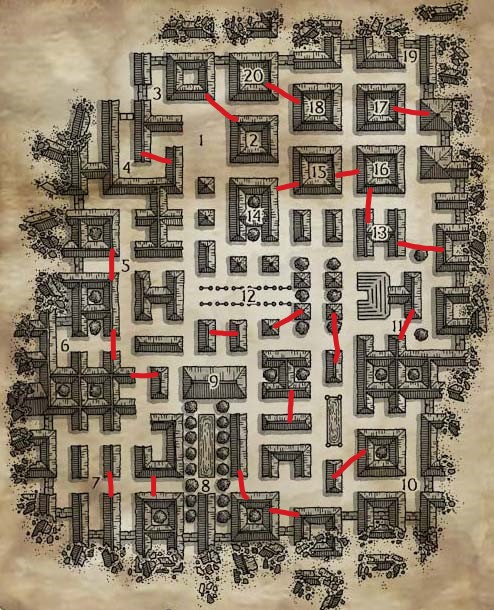 Voila, déjà pour ça. Pour la température pour Yvae, on est sur du stable 15° pas de nuages mais il fait sombre. OK pour le faucon. Baies nourricières : 2 fois 2d4 baies = 14 (j'ai l'impression que j'ai merdé le lancé mais tant pis...) Perception de Yvae....ben....que dire? vous voyez les satellites actuels? Ben ils sont aveugles à coté. Vous trouverez donc la carte des lieux avec les pièges mécaniques trouvées par Yvae (les lignes rouges. ) C'est intégralement des fils tendus. De la a savoir ce qu'ils déclenchent c'est une autre affaire. Dinenda tu ne vois que ceux qui sont a proximité du 7 pour le moment. Détection de magie te permet de voir a la limite de ton champ d'action que en bas a gauche du bâtiment 9 il y a une aura d'objet puissante d'évocation de force provenant d'un petit trou dans une pierre du bâtiment à gauche du 9 Et elle cache presque une toute petite aura mignonnette qui viens du même trou. Je vais romancer tout ca bien sur mais il faut quand même que les infos soient claires....vous jouez votre vie ^^ Et la carte pour Agath's,  C'est du fait maison a partir de trucs de ci de la...ne jugez pas trop sévèrement les erreurs de perspective et de proportions. XD Lancers... Yvhann - Baies nourricières : [3+3](2d4)+[4+4](2d4) = 14 Yvhann - Jet de compétence : Perception : 20(d20) +11(deg) +3(Sag) +2 (race). +8(visuel) +14 (faucon) = 58 Dinenda - Jet de compétence : Art de la magie : 3(d20) +9(deg) +1(Int) = 13 Dharasha - Jet de compétence : Perception : 6(d20)+5 = 11 Dinenda - Jet de compétence : Perception : 11(d20) +6(deg) +0(Sag) +2(racial) +5(sens draconique)+2 (familier) = 26 Azur'ael - Jet de compétence : Perception : 4(d20) +8(deg) +0(Sag) +2 (elfe) = 14 Azur'ael - Jet de compétence : Art de la magie : 19(d20) +15(deg) +6(Int) +3 (talent) +10 (Sort TM) = 53 ~ Réussite