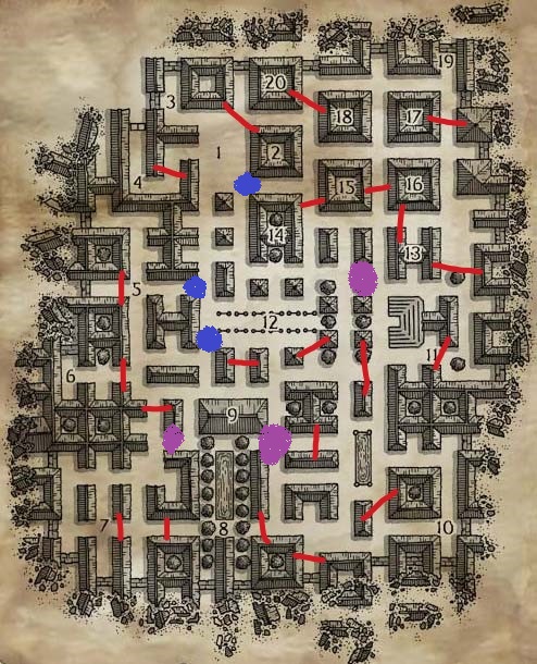 out a fait. Les pièges mécaniques sont les lignes rouges et je vous décrirais les zones des pièges magiques si vous en trouvez...mais avec la permanence de détection, je crois que vous allez vite trouver les autres.