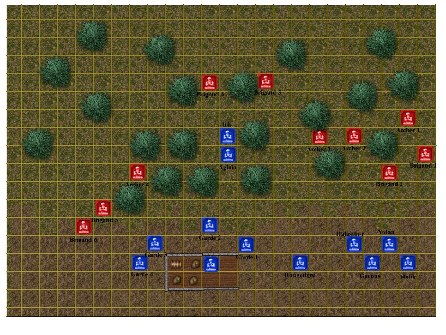 Brigand 3 avance et attaque Iris attaque=18 CA=14 réussit dégâts 2 pv Archer 1 attaque Yolan attaque=18 CA=19 échec Brigand 5 avance et attaque garde 3 attaque=17 CA=16 réussite dégâts 4 pv A Malik et Halasthor  Attention déplacements normaux divisés par deux pour tout le monde donc 2 cases pour tous maxi sauf Iris 5 cases. Le pas de placement est toujours possible ainsi qu'une charge mais sur 6 cases maximum de plus vous pouvez passer sur les cases occupées par les arbres sans vous arrêter dessus