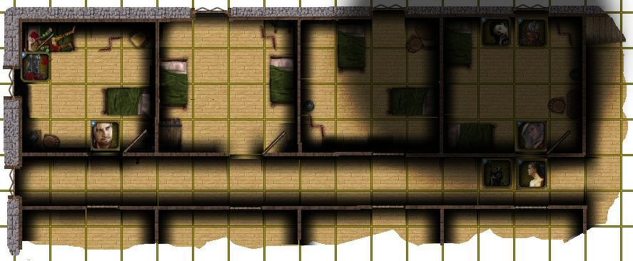Le barde illuskien quant à lui ne pouvait plus grand-chose pour son compagnon mort, mais peut être le pourrait-il pour ses amis vivants. Il regarda à son tour dans le couloir. Quelques mines curieuses et barbues pointaient ça et là au détour des portes, et des mouvements se faisaient entendre au fond du couloir en direction de l’escalier qui menait à la salle principale. Mais étrangement, sa vue humaine déjà peu habituée au noir de la nuit, fut mise à mal par une zone d’une obscurité encore plus absolue qui lui barrait totalement le champ de vision. Mais aussitôt un début de réponse lui vint en tête, car drows et magies des ombres étaient toujours très liés dans les contes et chansons. Initiatives Vieltal: 16(Dé)+1(Dex)+4(Science de l'initiative)=21 Miramal: 16(Dé)+3(Dex)=19 Ibealia : 7(Dé)+4(Dex)+4(Science de l'initiative)=15 Hermine : 13(Dé)+1(Dex)=14 Maha: 12(Dé)+2(Dex)-2(Eméché)=12 Drow: 4+3(Dex)+4(Science de l'initiative)=11