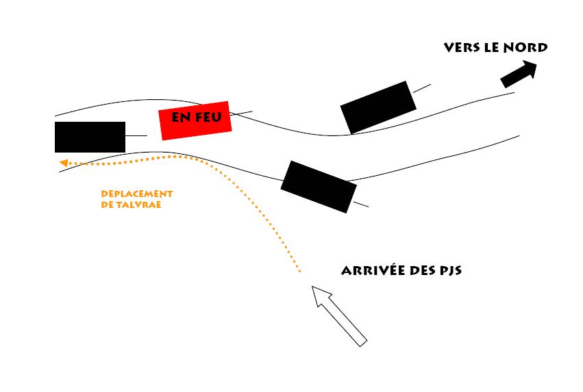 De la il pouvait mieux voir l’espace qui se trouvait devant l’entrée de la carriole. Il était aussi jonché de cadavres. Ils se préparaient à agir lorsqu’un des cadavres à cinq ou six de la carriole, dans l’axe du chariot, se releva d’un coup pour se retrouver assis ! Il, ou plutôt elle car s’était une humaine, bizarrement accoutrée, toussa un bon coup, s’appuya sur ses mains derrière elle, et regarda autour d’elle. Elle eu un mouvement de recul quand elle vit les trois aventuriers armes à la main, mais elle devint pâle et ses yeux s’écarquillèrent lorsqu’elle se mit à fixer l’intérieur du wagon noirci.  en pj un plan