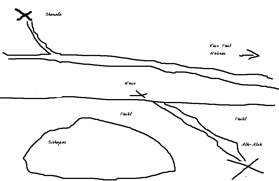 MJ Narration: Lhamo, Cyprien et Nob Sombreterre e fils Larford revint qur ses pas pour répondre à l'elfe cuivré pour répondre à ses interrogations. Il adressa à Rebhe-Llon un sourire timide. Profitant de l'humidité, le jeune homme enfonça son doigt dans la terre humide et traça un plan sommaire de la situation et tentant d’être aussi précis que possible. Satisfait de lui, il releva la tête pour voir celle de l’elfe qui regardait son plan et se sentit soudainement géné.- Je n’ai pas l’habitude, s’excusa-t-il, jetant tout à tour un regard à l’elfe et à Josh, par contre je ne suis pas certain du tout de l’étendu du territoire des Sishapas…. Une série de coup de tonnerre déchira le ciel et le jeune homme qui se releva soudainement, jetant un regard désabusé au ciel.- Le temps n’est pas avec nous ! Voilà l’orage maintenant, je ne sais pas si c’est une bonne idée d’entrer dans la forêt par un temps pareil, soupira Josh.Un nouveau roulement de tonnerre et une série d’éclairs d’une violence extrême ponctuèrent ses paroles.
