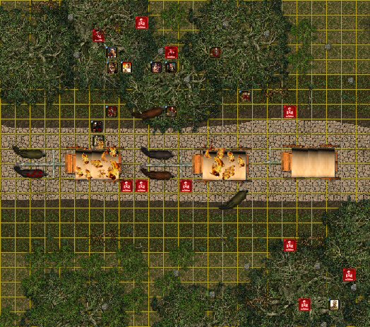 De son coté Lardreck, comme Ian et Karl s’était dirigé vers le dernier cheval de la caravane de tête. Celui-ci poussait des hennissements affolés, mais les gestes surs et la voix posée du nain, permirent de le calmer suffisamment pour qu’il commence à détacher l’animal. Quelle ne fut donc pas sa surprise, lorsqu’un rugissement bestial de douleur s’éleva. Tous l’entendirent, il était chargé de haine, de colère et de douleur. Pour échapper au chariot qui se consumait, et à une mort certaine, le puissant demi-orque venait de sauter à travers là bâche avant de retomber lourdement sur le sol. Les cheveux et les vêtements en feu, le barbare se roulait sur le sol en hurlant…