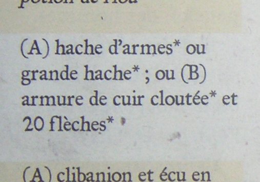 Équipement supplémentaire : (A) hache d’armes* ou grande hache* ; ou (B) armure de cuir cloutée* et 20 flèches