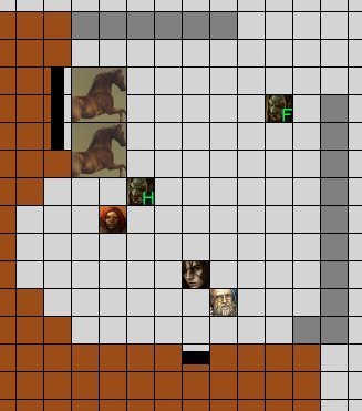 La demi-orque passait doucement sa main large sur l’encolure du cheval qu’elle s’était attribuée, et écoutait les propos peu rassurant de Mival Chenin, lorsque deux orques firent irruptions sous le porche d'entrée. La seule issue que la moine ait pu voir. Tonja avait déjà pu remarquer au cours de ses pérégrinations qu’il était coutume chez ce genre de brigands de deviser longuement en provocations. Elle s’éloigna de deux pas de sa future monture, alors que les orques ricanaient. Leurs intentions étaient claires, et la demi-orque ne se préoccupa guère de ce qu’ils avaient à dire. D’un même geste, elle tira sa fronde de sa ceinture de la main droite, et prit une bille dans sa besace. La moine commença à faire tournoyer son arme, espérant porter un premier coup rapide qui les prendrait au dépourvu. Sans un mot, elle visa celui armé d’une hache, moins pour laver l’insulte que par soucis d’éliminer celui qui pouvait être le chef du duo.Tonja arme sa fronde et tir.