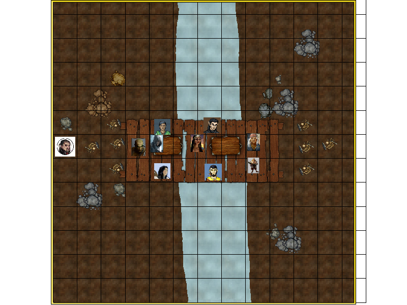 Le convoi ne mit pas longtemps à traverser la distance qui les séparait du pont et ce fût quand les deux chariots furent bien engagés que le piège se referma sur la caravane. Du sol sablonneux, quatre gardes de Baine surgirent de chaque côté du pont tenant en tenaille l'ensemble des voyageurs. Le souci fût que l'étroitesse du fragile pont en bois les empêchait de rouler côte à côte les roues du chariot frôlant les bords du pont de chaque côté. C'est ainsi que le groupe se trouvait dorénavant coupé en deux, ils n'avaient plus la possibilité de fuir et surtout à l'arrière celui qui semblait être le maître des créatures semblait bien décidé à les transformer tous en esclaves sans cervelle... En effet, un homme en armure noire au casque ailé et aux motifs rappelant ceux des adorateurs de Baine se tenait à quelques mètres derrière le groupe de morts vivants. Il portait un fléau de guerre dans une main, dont les poids avaient été remplacés par des crânes humanoïdes et un écu réfléchissant, comme un miroir, dans l'autre. D'une main gantée de fer, il donna un ordre muet à ses créatures qui se mirent à avancer vers les chariots, leurs yeux étaient éveillés pars des flammes rouges pleines de malice. Vous l'aurez bien compris vous êtes dans des beaux draps...Je vous prépare la carte en ce moment même.