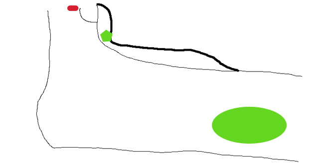 Edit: J'ai attaché un schéma. Je n'avais pas éxagéré mon manque de talent mais j'ai utilisé mon ordinateur au lieu d'un crayon. La grosse ellipse est le reste du groupe, le pentagone est ta position et le rectangle aux coins arrondis est l'orque que tu as entrevu. Le "chemin", trait noir plus épais, conduit au-dessus de la guérite où il se trouve. Pour y accéder, il faut escalader quelques mètres de falaise vers le bas puis se faufiler dans une fissure dans le mur. Si tu te rends dans cette direction, tu ne peux pas voir grand chose à travers la fissure, si ce n'est qu'il y a au moins deux orques et qu'une corne se trouve dans un trou dans le mur à environ une longueur de bras de la sortie de la fissure. J'espère que c'est un peu plus clair.