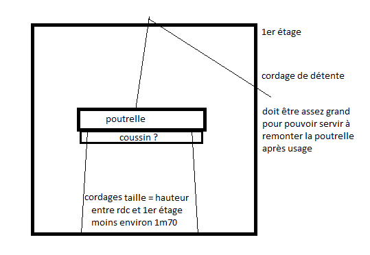 Après une bonne demie-heure de discussion difficile, ils finirent par trouver un consensus : piège il y aurait, la Taupe aurait un peu plus de sacrifice et Nia, quoique ne pouvant pas assister au spectacle aurait l'occasion de mettre son imagination au service du macabre. Ils avaient décidés qu'ils partiraient avant l'arriver de la relève, par conséquent il fallait que le piège se déclenche tout seul. La poutre ne fut pas facile à déplacer. Mieux que le bois, l'une des poutrelle de métal dont l'usage leur était encore mystérieux vint se placer à coté du hall. L'agile Nia y fixa la première corde et escalada rapidement murs et lustres pour aller passer l'autre coté de la corde dans l'un des lourds anneaux d'acier fixés à la charpente, de tout évidence utilisé de la même matière pour hisser la marchandise à l'étage. L'appât du gain signait toujours la perte de ses bénéficiaires... Xanthos alla terminer d'empaqueter les rations d'humain séché sans oublier de bien répandre le sang dans la cuisine, histoire d'augmenter un peu le morbide. Impossible cela dit de tout emmener. Pendant ce temps, sur une idée du mécanique Quantun et avec l'appui intellectuel des deux autres, l'automatisation du piège pris forme. Avec un peu plus de cordage, le filin fit le tour du balcon et descendit le long du mur devant la porte du vestibule. La corde fut tendue en bas de la corde, fragilisée et bloquée de manière à l'aide d'un boulon coincé dans une patère. Le moindre pied qui se prendrait dedans à cadence normale libérerait la corde et déclencherait le piège. Vu la taille de la poutre, nulle doute qu'elle ferait des dégâts, même si le groupe ne se trouvait pas au milieu de la salle.