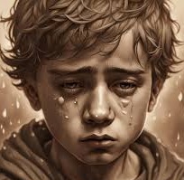 Les joues maculées de larmes et de poussière, les cheveux sales et emmêlés, cet enfant sale et dépenaillé est complètement terrorisé. |