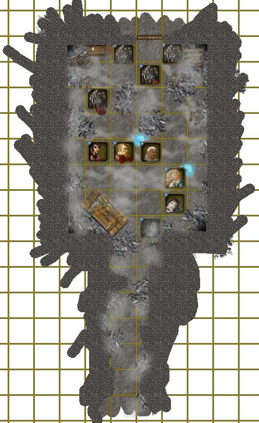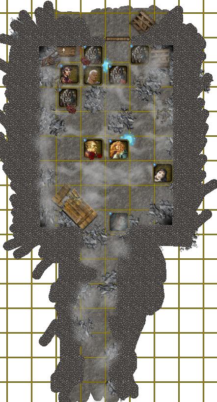 MJ4ème Round. Jet d'initiative du 3ème Gardien macabre : 5(Dé)+0=5. Jet d'initiative du 4ème Gardien macabre : 20(Dé)+0=20. Jet d'initiative de Ielenia : 4(Dé)+0=4. Jet d'initiative de Fillow : 1(Dé)+0=1. Jet d'initiative de Karou : 9(Dé)+1=10. Jet d'initiative de Nénharma : 17(Dé)+0=17. Jet d'initiative de Zémobiel : 9(Dé)+1=10.Jet d'attaque à distance de Nénharma : 17(Dé)-2(Poussière)+2(Adversaire acculé)+0=17 Réussite. CA du 3ème gardien macabre : 4(Dé)+6=10 Echec. PV du 3ème gardien macabre : 11-7(Bras droit)=4pv. Karou avance de 4,5m. Jet d'attaque de Karou : 11(Dé)-1(Poussière)+2(Adversaire acculé)+0=12 Echec. CA du 3ème Gardien macabre : 11(Dé)+6=17 Réussite. Zémobiel avance sur sa droite d'1,5m (Pas de placement). Jet d'attaque à distance de Zémobiel : 19(Dé)-2(Poussière)+2(Adversaire acculé)+2=21 Réussite. CA du 4ème Gardien macabre : 12(Dé)+6=18 Echec. PV du 4ème Gardien macabre : 16-4(Bassin)=12pv. Ielenia avance sur sa gauche d'1,5m (Pas de placement). Jet de premiers secours d'Ielenia DD15 : 17(Dé)+4=21 Réussite. Gurthang est stabilisé. Fillow charge sur 4,5m. Jet d'attaque de Fillow : 17(Dé)-1(Poussière)+2(Charge)+2(Adversaire acculé)+1(Taille)+3=24 Réussite. CA du 3ème Gardien macabre : 4(Dé)+6=10 Echec. PV du 3ème Gardien macabre : 4-4(Jambe droite)=0pv Détruit. a réussite d'Ielenia dans son appel à Lathandre avait nettement fait tourner le combat à l'avantage des aventuriers et il ne faisait maintenant plus aucun doute sur l'issu du combat. Il restait juste à rendre innoffensif les deux gardiens macabres et à sauver Gurthang avant que le seul vrai combattant du groupe n'aille rejoindre tout ceux qui avaient déjà succombé. Le groupe était encore bien loin d'être soudé et personne ne se connaissait vraiment d'ailleurs, certain n'avaient même pas en tête le nom peut-être lancé à la va vite à un moment donné de celui qui luttait à ses côtés pour tenter de sauver sa vie. Ils verraient cela plus tard, pour le moment fuir et se mettre à l'abri était la seule chose importante, la seule nécessité... Mais la prêtresse du Seigneur de l'Aube ne pouvait laisser personne derrière elle. Ielenia savait ce qu'elle avait à faire pour sauver le grugach, après un garot et un bandage bien serré elle stabilisa l'état de Gurthang qui aurait sans doute succombé si elle n'avait pas réussi à repousser les morts-vivants, les dieux étaient encore avec eux à moins que ce ne fut que la chance et dans ce cas ils auraient à verser un lourd tribu à Beshaba...