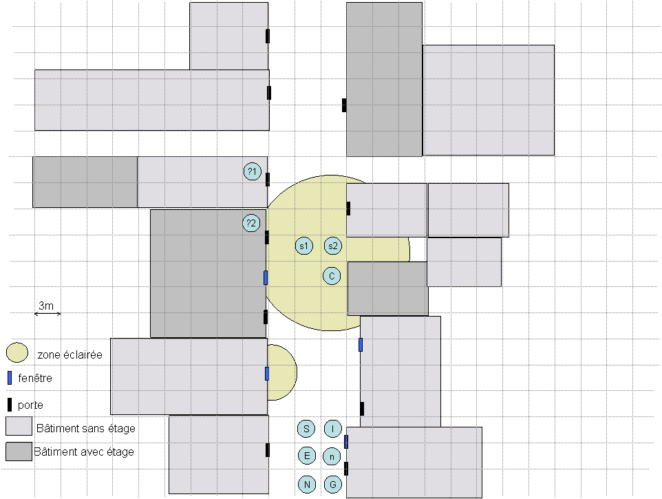 MJTousNarvath et Gral rejoignirent le reste du groupe sur la route longeant le port. La nuit était assez claire, assez pour se déplacer sans risque mais pas assez pour distinguer les deux cadavres sans vraiment se concentrer sur la zone. L’elfe les avait rejoints et ils purent donc prendre tous la direction des quartiers Nord de la ville. Les rues étaient désertes à une heure aussi tardive. Seuls les hululements de hiboux perchés sur les toits ou quelques bruits étouffés de chants à boire troublaient le calme du moment. Il leur fallut environ une heure pour rejoindre les dits quartiers, tout en suivant les explications de la barde. Mais alors qu’ils ne pensaient plus qu’à trouver une auberge pour dormir les quelques heures qui les séparaient du lever du soleil, la voix d’un homme vint les déranger : - (Commun) Holà voyageurs. Il se fait bien tard pour circuler dans la ville, et surtout par ici. Approchez vous donc me montrer vos sauf-conduits et m’expliquer ce que vous faites ici aussi tard. L’homme, vêtu d’une cotte de mailles recouverte d’un tabard vert délavé aux armoiries de la ville, était posté le long d’un bâtiment avec deux autres soldats armés de lances derrière lui. Il plissa les yeux et eut un mouvement de recul quand il discerna plus nettement Gral. -(Commun) Toi, le grand, euhhh, tu restes calme, c’est juste un contrôle de routine. D’accord ? Approchez vous maintenant. L’un des soldats alluma une lanterne qu’il posa sur un tas de bois non loin.SuthekLe nain s’apprêtait à obtempérer lorsqu’il aperçu deux hommes postés sur les toits avoisinants. La milice était rudement prudente à n’en point douter.  Vous trouverez le plan de la zone avec vos noms (n = néphénie la louve, N = Narvath)