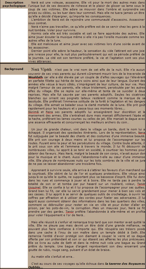 Nerä, pourrais-tu copier-coller ton BG et ta description psychologique dans un Post à la suite ? Je pourrais alors l'intégrer dans la fiche Word.