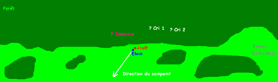 Dix-Huitième jour de la Flétrissure-Année de la Magie Sauvage 20 Eleinte 1372Lieu :Sur la Voie des Landes Eternelles, en direction de Fort Olostin Temps : Environ 6° Moment : Fin d’après-midiMJ Narration: Asulf et Elwin Test de survie Asulf DD 15 : 12 (dé) + 4 (Comp) : 16 : Réussite Test de survie Elwin DD15 : 14 (dé) + 6 (comp)= 20 : Réussite es aventuriers se trouvaient à proximité du bois d’argent, qui autrefois, faisait partie intégrante de la Haute-Forêt, était aujourd’hui une manne pour les bûcherons et forestiers qui s’employaient à exploiter les lieux comme le prouvait cette plaie d’une trentaine de kilomètres de large qui existait dans cette forêt laissant des contreforts nus jonchés de vieilles souches qui bordaient les lieux laissant la place à une masse inextricable de sombres fourrés protégés par un terrain pentu et traître.