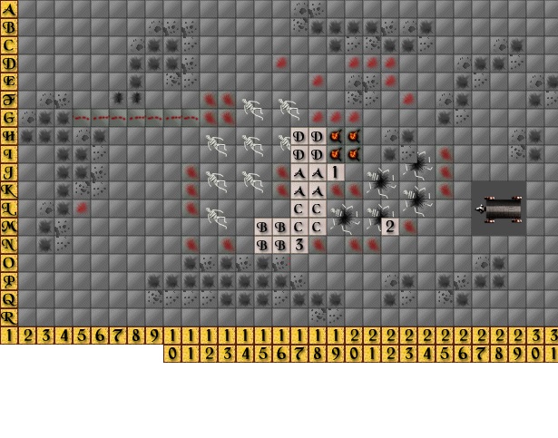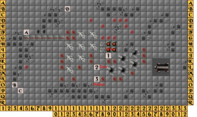 C'est alors que des gerbes de flammes enveloppèrent l'ogre que Mjollnir venait de frapper et le firent choir au sol. Ils étaient à égalité.Cliquez ici pour dérouler le parchemin... Round 2 Kuan attaque B (jet 21 touché dégâts 7+1)+pas de placement Mjöllnir attaque B (jet 21 touché dégâts 3) A déplacement C déplacement et attaque Mjollnir échec Cycas attaque déluge de coups D (touché dégâts  B attaque Mjollnir échec D attaque Cycas Round 3 Déclenchement effet gants phénix dégâts 4 B au sol inconscient. Kuan Mjöllnir A C Cycas D Nota Bene : l'ogre B est inconscient, mais il crée une zone de déplacement difficile, il reste donc marqué sur la carte et j'ai anticipé l'effet des gants du phénix.