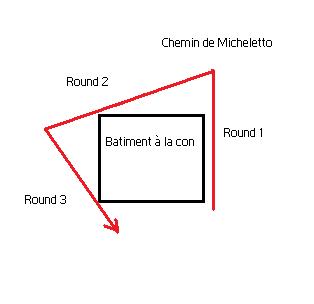 Non en effet je ne la connaissais pas, et je ne la trouve pas très réaliste puisque dans les courses hippiques ils font bien tourner leur cheval au galop, en prenant un virage assez large. Enfin bon peu importe, c'est comme ça, mais ça n'empêche toujours pas par principe un contournement. C'est juste que je passerai (en reprenant les hypothèses de tout à l'heure) de deux à trois round avec une attaque portée lors du 3è round. J'ai jamais été bon en géo mais ça devrait donner un truc dans le genre si je ne m'abuse :