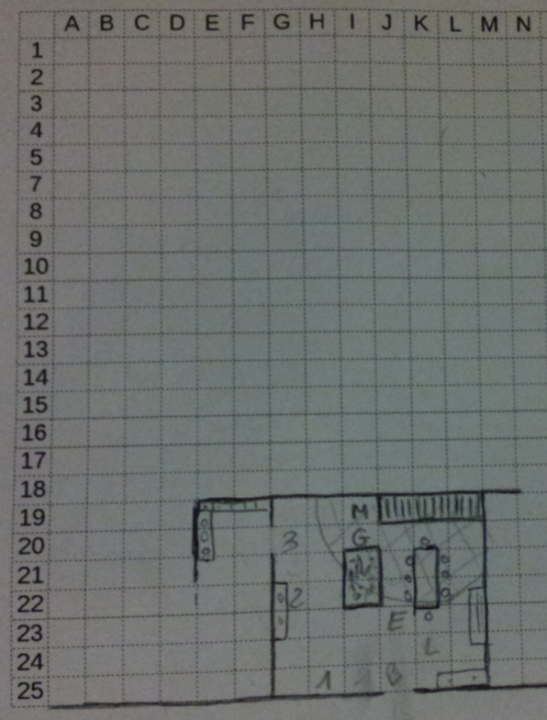 Initiatives:Eldrad - joué Boroneth Gweadal Lyloo Melkiot Ennemi 3 (Mage) Ennemi 1 (femme en armure) Ennemi 2 (fuyard) Ennemi 4 (à l'étage)