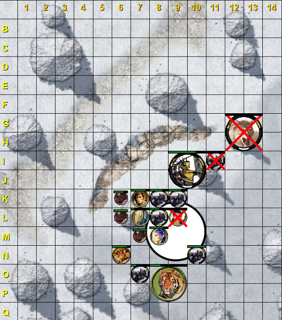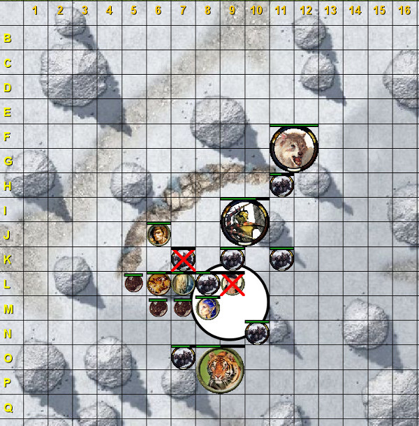 Et ce fut ainsi, que le Seigneur de Mythdae, rompit l’assaut pour un moment. Laissant la première ligne aux druides et leurs compagnons animaux, il alla se mettre à l’abri derrière un monticule recouvert de neige. Heureusement que son sortilège de raquette, lui permettait de se déplacer aussi aisément que s’il n’y avait pas de neige. Une fois à l’abri, il fallait se soigner et réévaluer une stratégie plus efficace et plus adaptée à ses compétences. Aël’Telàwërith fait une retraite jusqu’en P-3 en contournant le monticule en O-4 par le nord, donc en ne passant pas à côté du drow en O-7.