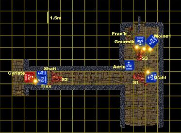 Jet d’Initiative de Shait : 7(Dé)+6=15. Jet d'Initiative de G’ahl : 8(Dé)+5=13. Jet d'Initiative d'Aérie : 2(Dé)+3=5. Jet d'Initiative de Fixx : 20(Dé)+2=22. Jet d'Initiative du 1er Moine : 1(Dé)+2=3. Jet d’Initiative du Prêtre : 8(Dé)+2=10.
