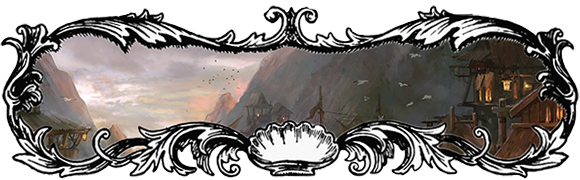 Reïlo Blanche Flamme, Gulmar & Mirtzar Boucledacier La température était plus clémente dès lors que l’on arrivait à s’abriter des vents dominants qui balayaient la côte depuis le grand Nord. Le soleil restait puissant et les odeurs plus encore. Les ombres se mouvaient parmi les chaumières aux riches sculptures et les vestiges de maisons réduites à des amas de pierres au milieu desquels se dressaient quelques cabanes et autres tentes. Ici, aucune unité dans cet assemblage, tous les styles architecturaux semblaient représentés. Les trois visiteurs s’enfoncèrent à la découverte du village et longèrent en premier lieu de nombreux ateliers, tous principalement dédiés à répondre aux nécessités de la vie marine.